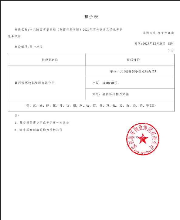 | 1 | 物业管理服务 | 室外保洁和绿化养护服务 | 满足磋商文件服务范围 | 满足磋商文件服务要求 | 2024年1月1日-2024年12月31日 | 满足磋商文件服务标准 | 1,580,000.00 |
