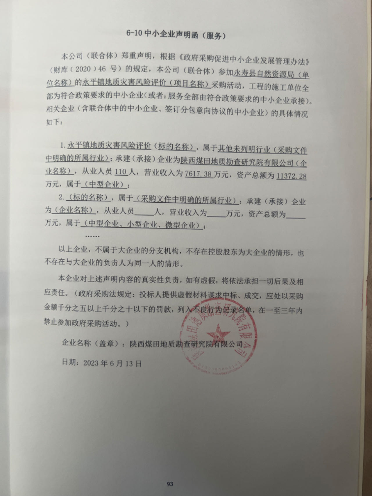 | 1 | 工程和技术基础科学研究服务 | 1项 | 按照《陕西省城镇地质灾害风险调查评价技术要求(1:10000)》(试行)完成永寿县永平镇地质灾害风险调查各项任务,对典型地质灾害隐患点进行勘察,开展地质灾害易发性、危险性,易损性,风险性评价,进行地质灾害风险性分区,防治分区,完善乡镇地质灾害数据库建设。 | 具体工作方法和技术要求、技术指标及质量要求按照国家或行业标准、规范进行 | 合同签订后6个月 | 具体工作方法和技术要求、技术指标及质量要求按照国家或行业标准、规范进行 | 1,200,000.00 |