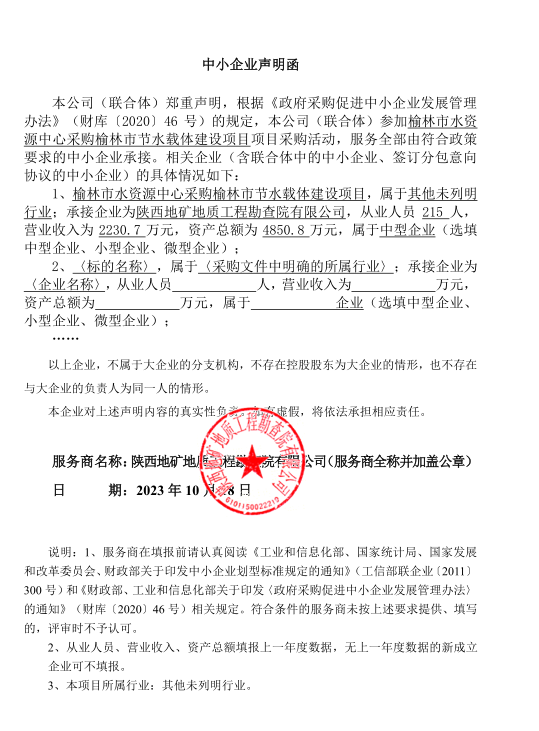 | 1 | 技术测试和分析服务 | 榆林市节水载体建设项目 | 满足竞争性谈判文件要求 | 满足竞争性谈判文件要求 | 自本合同签订生效之日起2个月内完成项目水平衡测试的外业、室内资料整理、编制完成报告及修改完善工作,并经水行政部门专家咨询评审;同时完成节水器具改造,并通过甲方组织的验收。若遇不可抗力影响以及非乙方原因造成的停、窝工时,服务期顺延。 | 满足竞争性谈判文件要求 | 762,900.00 |