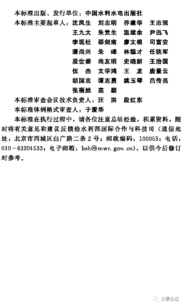 本标准在执行过程中,请各位注意总结经验,积累资料,随时将有关意见和建议反馈给水利部国际合作与科技司(通信地址:北京市西城区白广路二条2号;邮政编码::100053;;电话:010 - 63204533;电子邮箱: bzh@mwr. gov. cn),以供今后修订时参考。